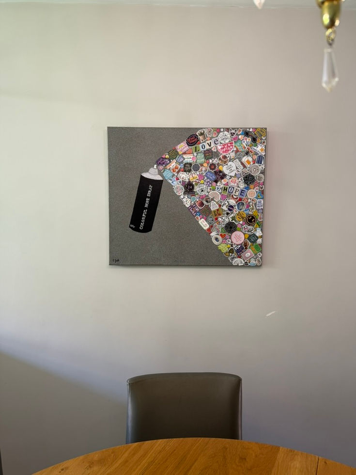 יש כאן מיכל ספריי צבע שחור לכאורה , פשוט וקשוח, אבל בוקע ממנו זרם מתפרץ ומפתיע של צבע, חיים, שמחה ותקווה. ספריי צבעוני עשוי כולו ממאות סטיקרים קטנים- מסרים חיוביים, לבבות, כוכבים, מילים של אהבה וניצוץ של תמימות ואופטימיות.