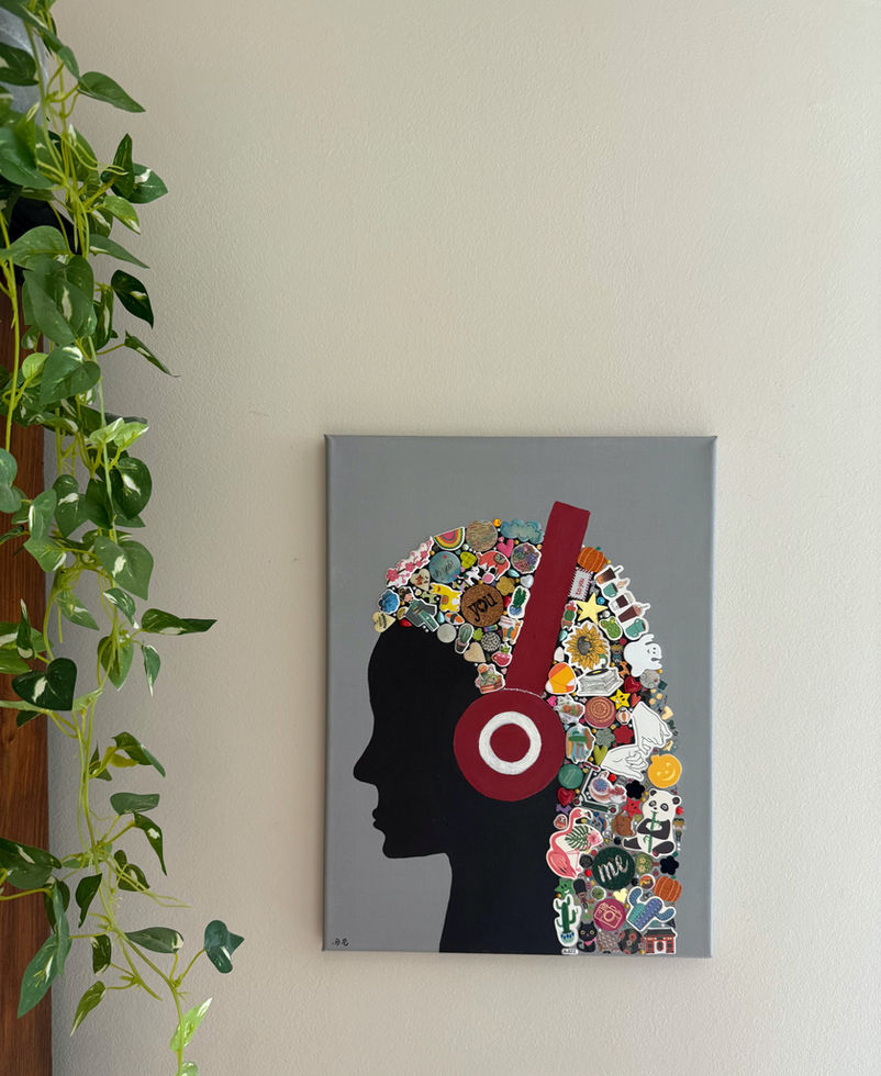 אקריליק וסטיקרים על קנבס מתוח על עץ